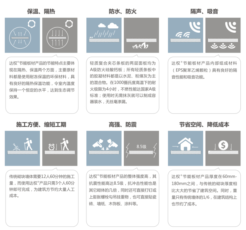 達權(quán)防水隔墻特性:達權(quán)防水隔墻具有良好的防水、防潮性能,可用于廚房、衛(wèi)生間、地下室等潮濕區(qū)域,墻體不會因吸潮而松化、返鹵、變形、強度下降等現(xiàn)象。