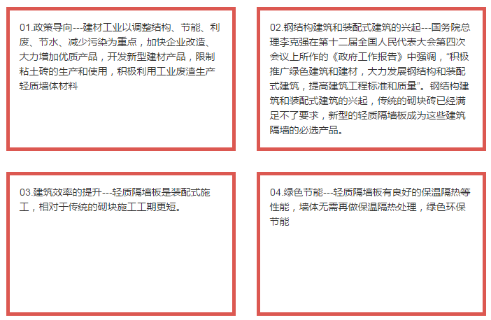按照國(guó)家十三五規(guī)劃,至2020年,我國(guó)裝配式建筑要占全部建筑中的比重不低于30%,那么,在未來(lái)五年,新型裝配式墻體材料及相關(guān)產(chǎn)品將有幾十倍的增長(zhǎng)。《國(guó)家"九五"計(jì)劃與2010年國(guó)家經(jīng)濟(jì)發(fā)展鋼要》再次強(qiáng)調(diào)"建材工業(yè)以調(diào)整結(jié)構(gòu)、節(jié)能、利廢、節(jié)水、減少污染為重點(diǎn),加快企業(yè)改造、大力增加優(yōu)質(zhì)產(chǎn)品,開(kāi)發(fā)新型建材產(chǎn)品,限制粘土磚的生產(chǎn)和使用,積極利用工業(yè)廢渣生產(chǎn)輕質(zhì)墻體材料"。