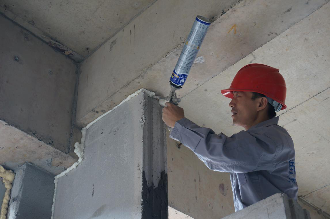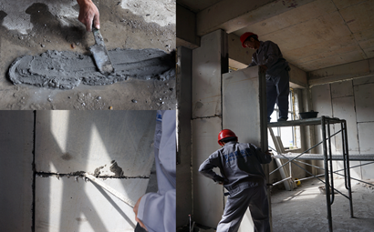 用電動工具攪拌粘合劑,按配方均勻拌合,干濕適中,粘合劑要隨配隨用,并應(yīng)在30min內(nèi)用完。墻板與地面,與其他墻、柱接觸處涂抹粘合劑,由二人將墻體按墻體線扶正就位,一人拿撬棒,就位后,由一人在一側(cè)推擠,準(zhǔn)確對線,一人用撬棒將墻板撬起,邊撬邊擠,并通過撬棒的移動,使墻板移在線內(nèi),是粘合劑均勻填充接縫,使凹凸楔口連接緊密,互相咬合,楔口內(nèi)粘合劑飽滿(以擠出漿為宜)。