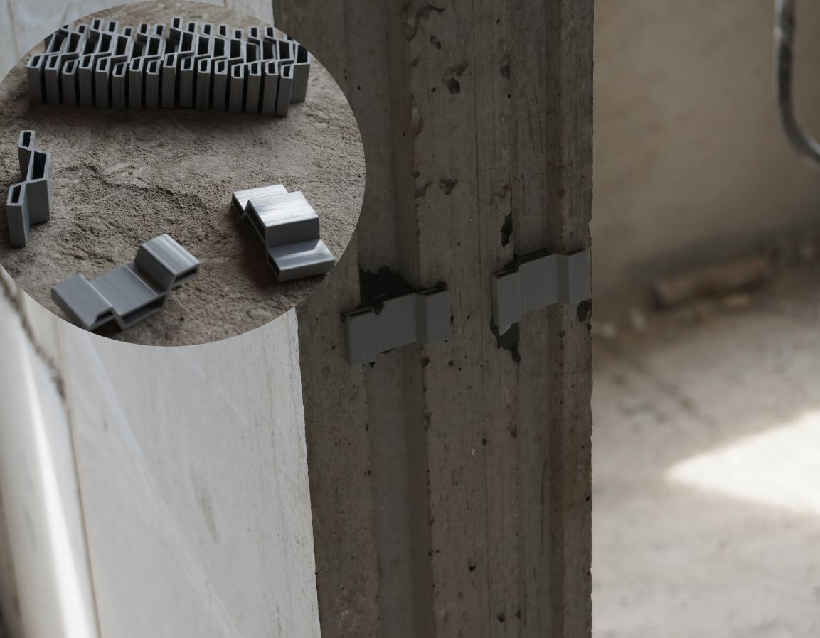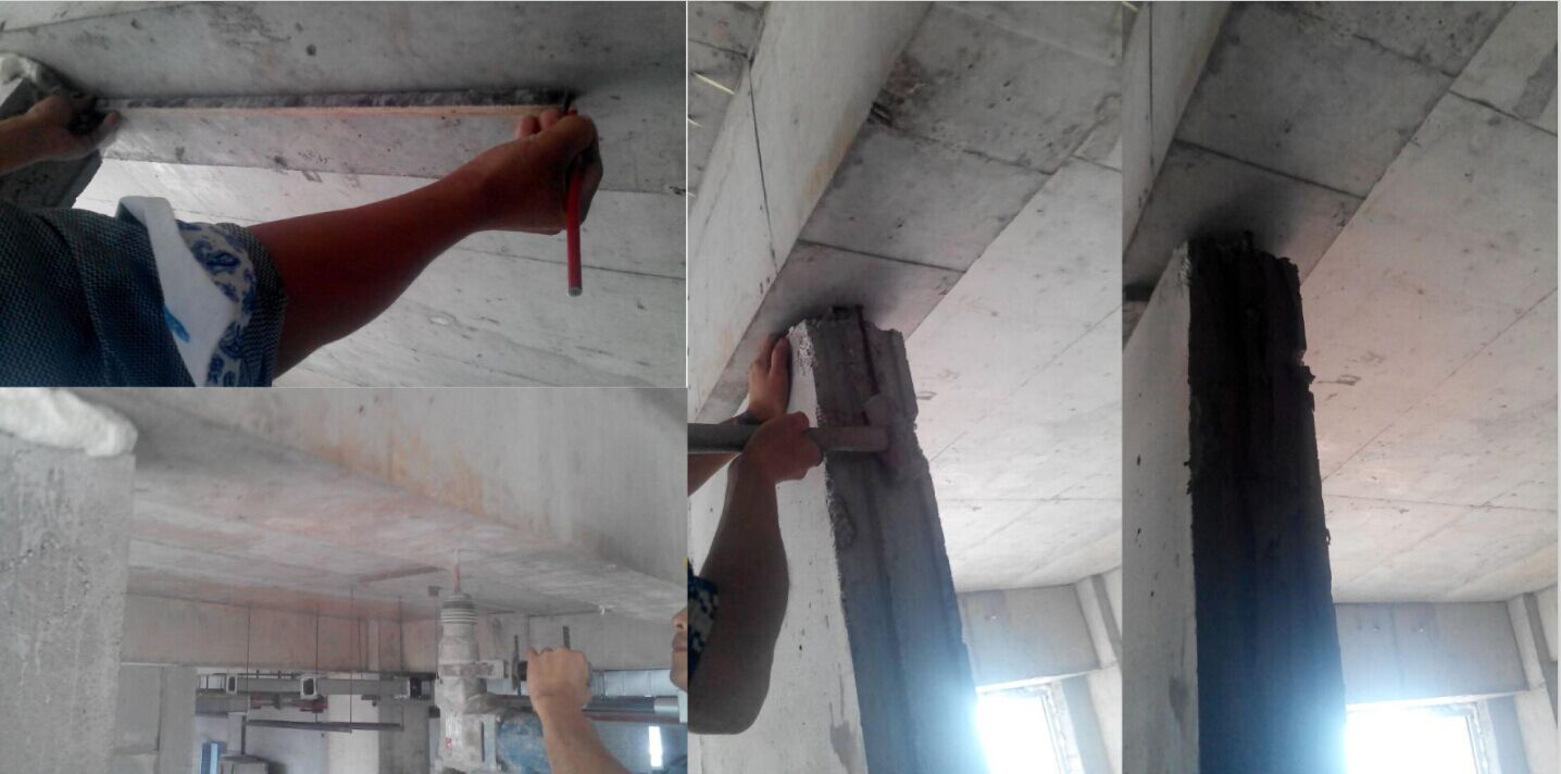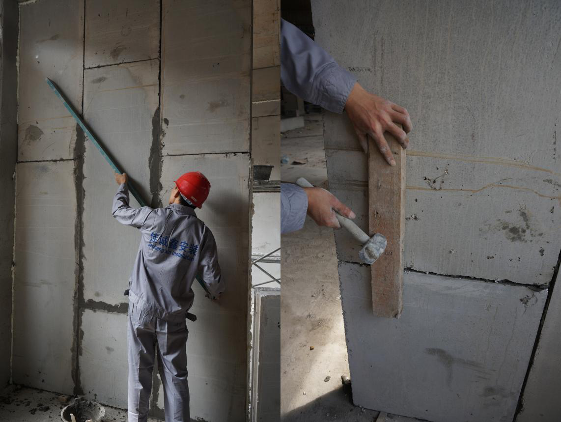 準(zhǔn)備膠楔,拿好鐵錘,待對準(zhǔn)線的時候,撬起墻板不動,用膠楔固定,鐵錘敲緊,由于墻板對線就位為粗調(diào)校,加上膠楔緊固時稍有微小錯位,一般需要重新調(diào)校即微調(diào)(一般在5mm以內(nèi)的平整度調(diào)整),板下端可通過捶打膠楔使之調(diào)整在允許偏差范圍以內(nèi)。